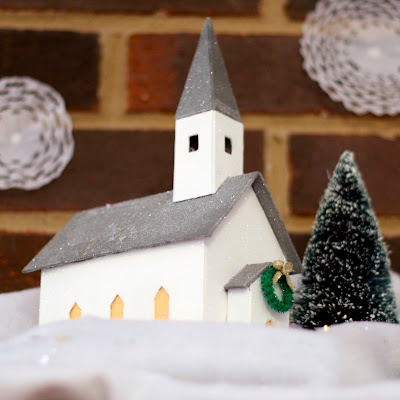 I made the wreaths from pipe cleaners and little bows I made from tiny wired ribbon. It's all put together with a hot glue gun. Here is the template I used for the church: Template #1
